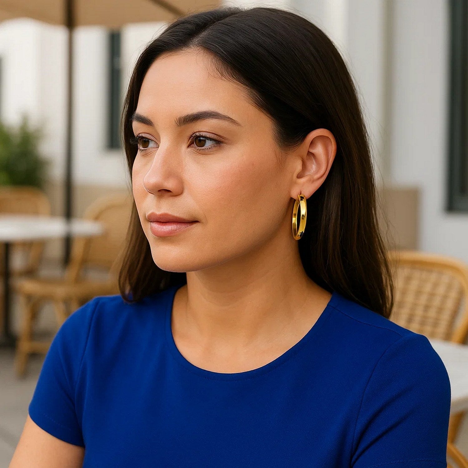 These 35mm Wedding Band hoop earrings are the perfect elegant & stylish design. These will definitely add a bit of uniqueness to your collection. Crafted in 14k yellow gold with a high polish finish & a snap closure.
