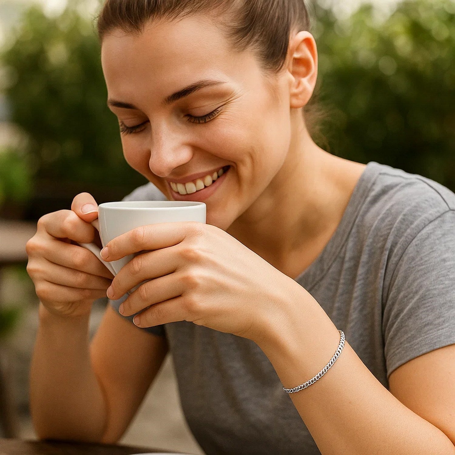 This solid curb bracelet comes in 14k white gold and has a width of 3.6 millimeters. Secured with a lobster clasp.