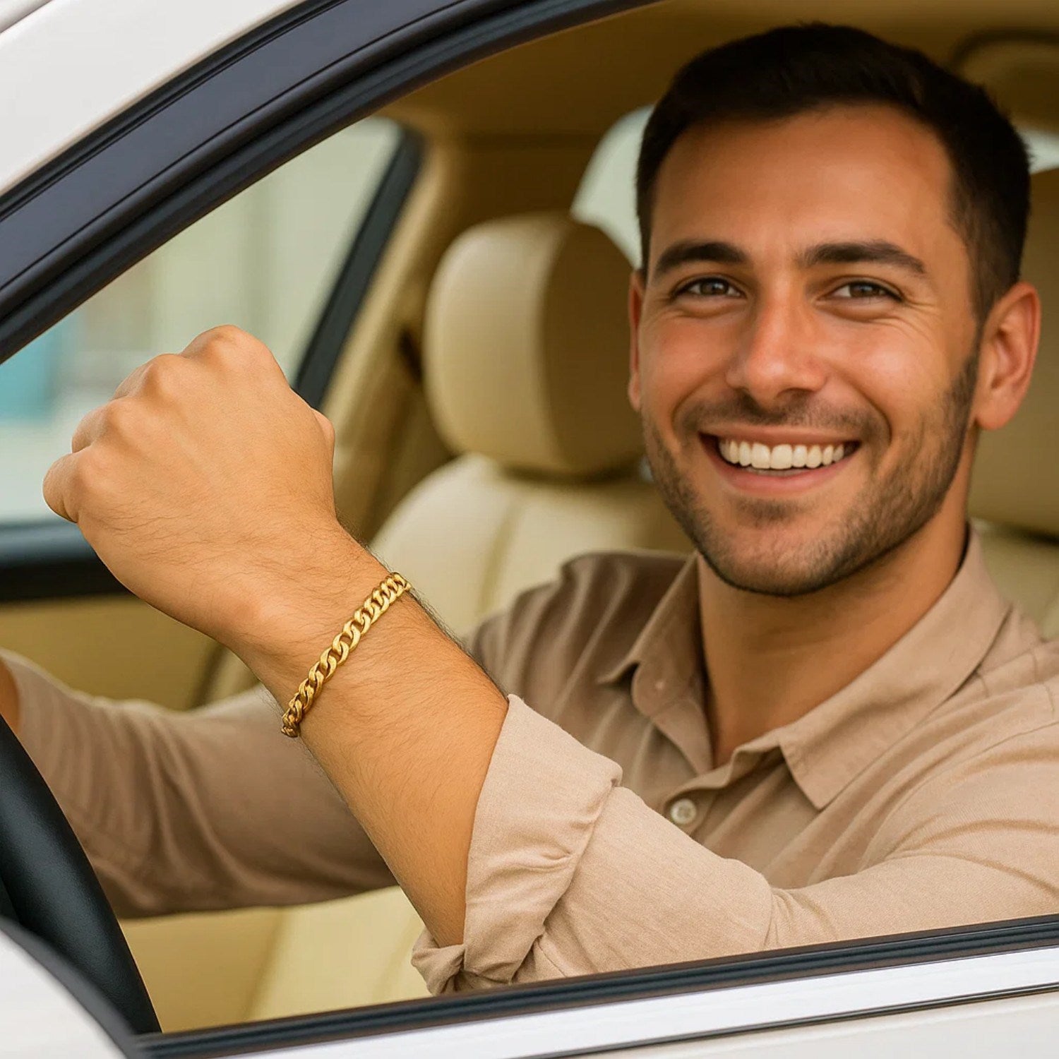 This Miami Cuban semi solid bracelet comes in 14k yellow gold and has a width of 6.7 millimeters. Secured with a lobster clasp.