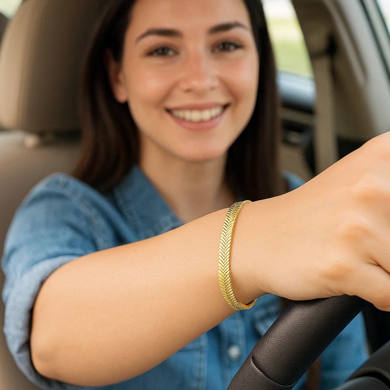 Crafted in 14K yellow gold, this oval snake chain bracelet features a 5.30 mm width with a smooth, rounded surface that offers a sleek and elegant appearance. Its flexible structure ensures comfortable wear. Finished with a secure lobster clasp and available in lengths measuring 7 inches.