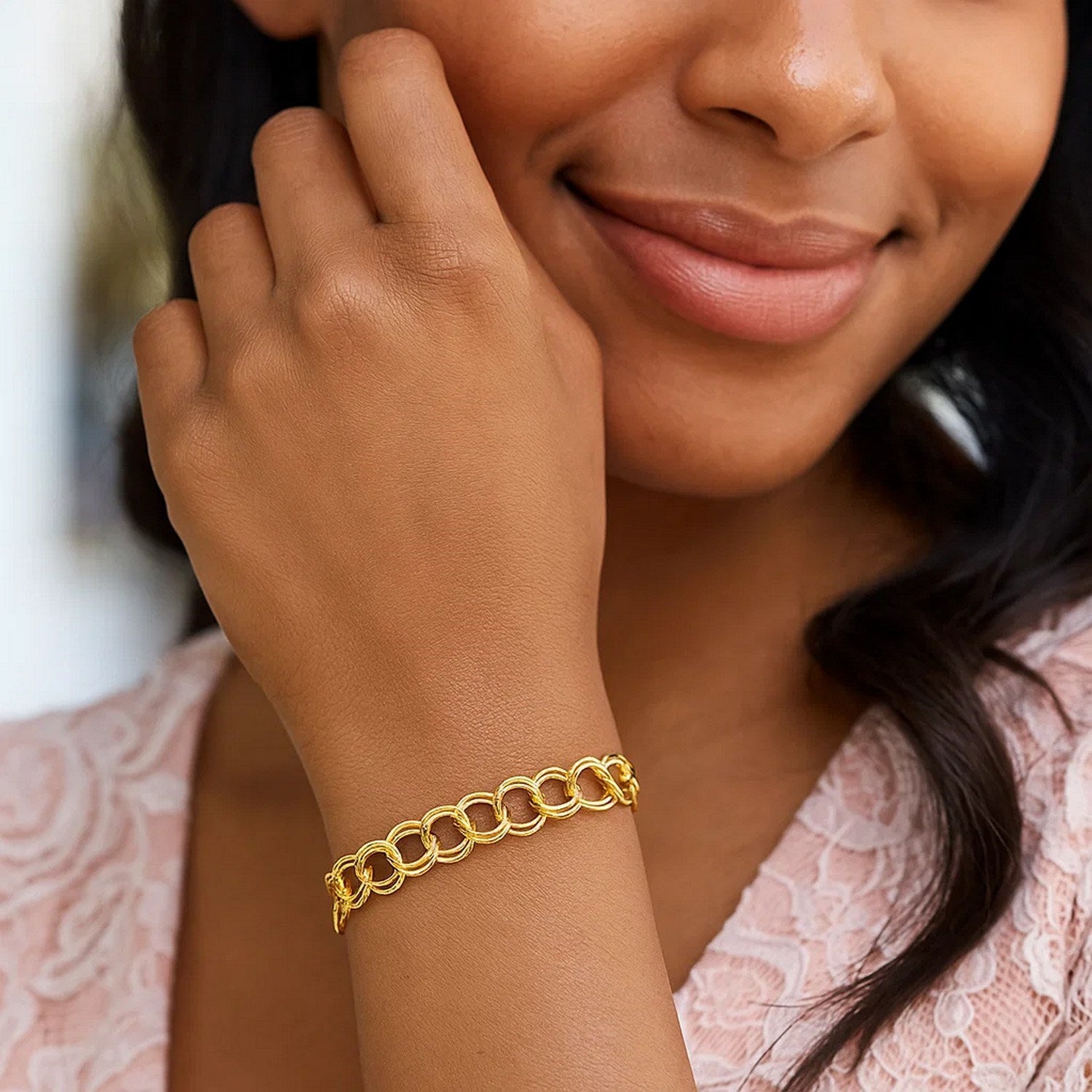 This solid double link charm bracelet is crafted in glistening 14k yellow gold and has a width of 8.0 millimeters.