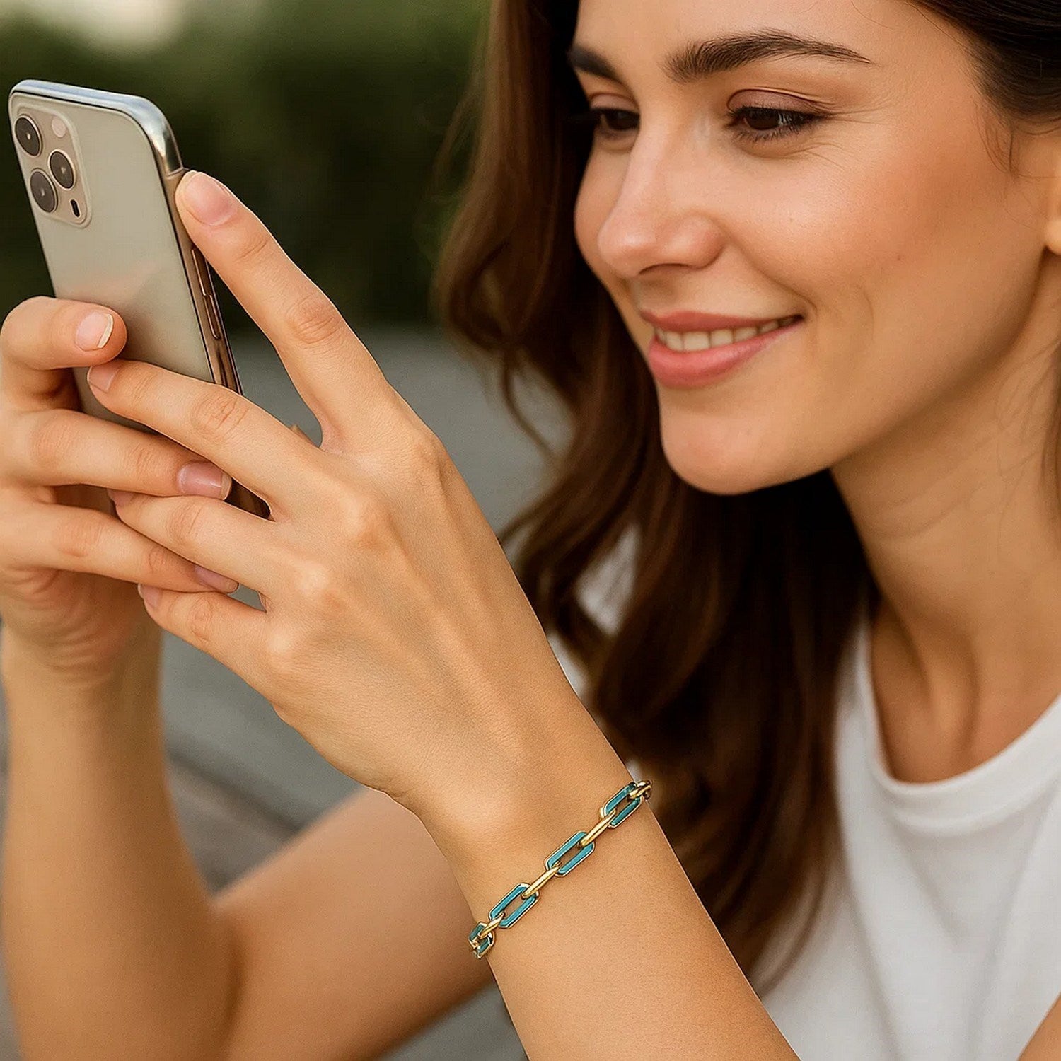 An exquisite 14k yellow gold paperclip gem link bracelet, highlighting a blend of gold and turquoise links in a contemporary style. Bracelet is 7 1/2 inches long and secured with lobster clasp.