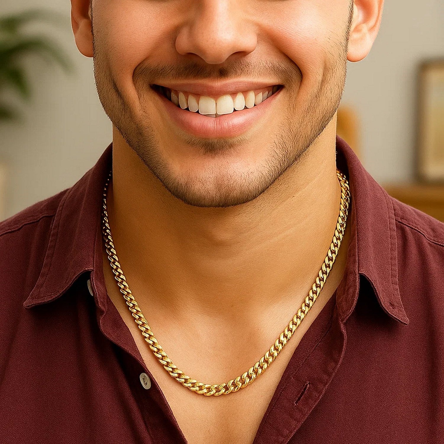 This classic Miami cuban solid chain comes in 14k yellow gold and has a width of 5 millimeters.