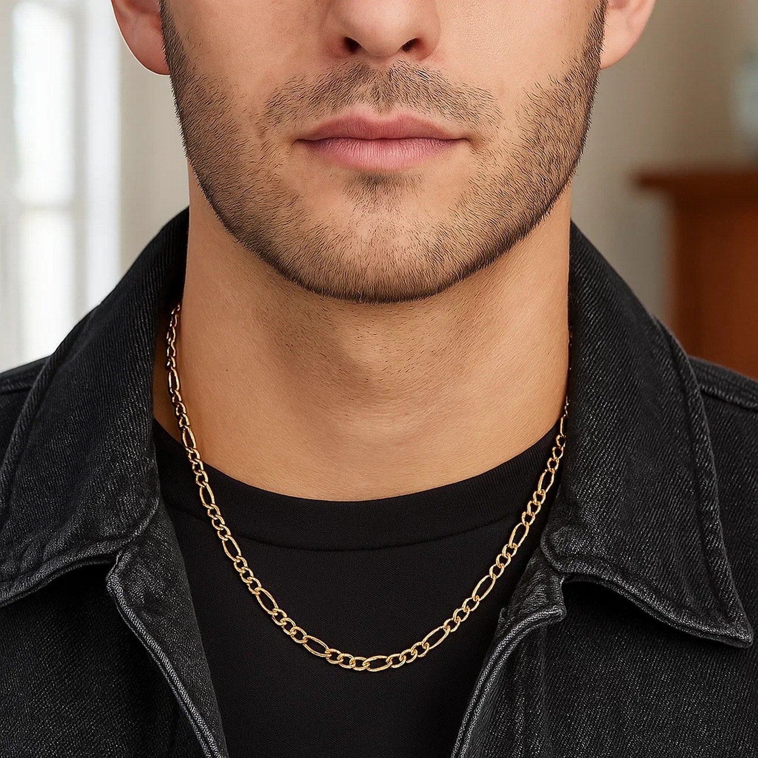 This solid Figaro chain comes in 14k yellow gold and has a width of 4.50 millimeters.