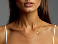 Delicate cable chains are attached to the top and bottom sections of a minimalist and flat crucifix element. This necklace radiates faith and is designed in 14k yellow gold. Comes in size 18 inches.